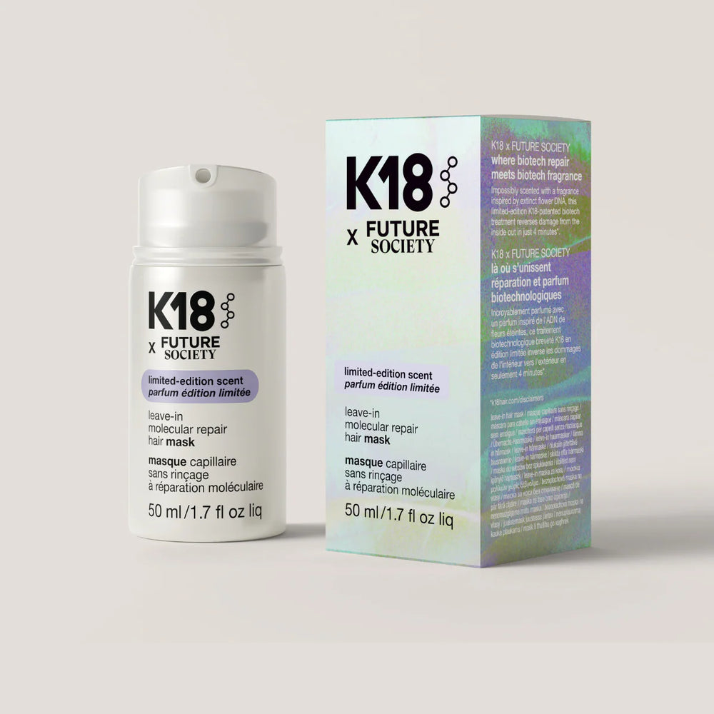 K18 Molecular Repair Mask has been re-imagined for the Future Society collection — now infused with a custom-engineered biotech fragrance that feels as innovative as the science behind the formula. The mask still delivers the transformative repair K18 is renowned for, powered by biomimetic peptide technology that works at the molecular level to restore strength, softness, and resilience to damaged hair. The new fragrance profile is designed through biotechnology to echo the future of beauty — clean, sophisticated, and sustainably crafted. Together, the performance and sensorial experience elevate hair repair into a ritual of modern luxury.